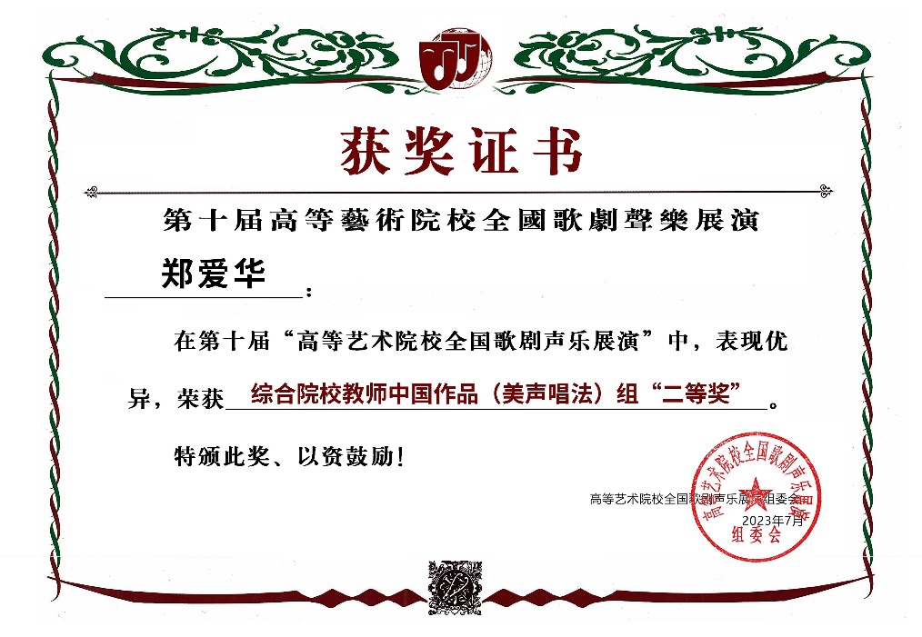 2023年7月参加第十届高等艺术院校全国歌剧声乐展演获“综合院校教师中国作品(美声唱法)组 二等奖”